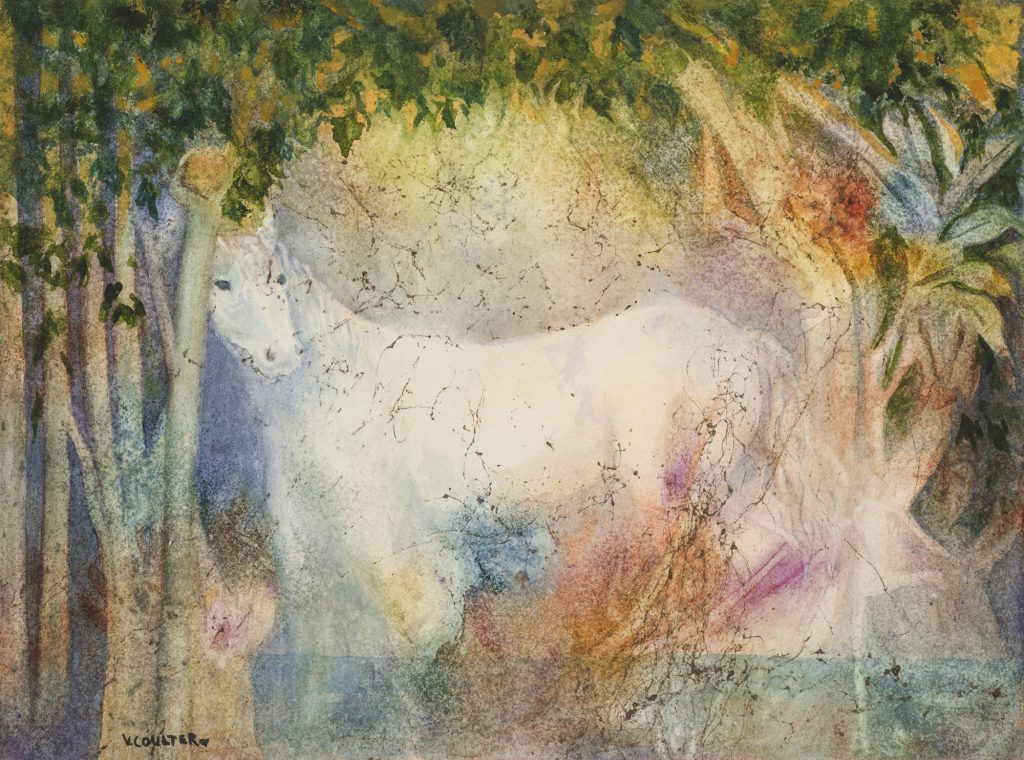 I began this painting as a gift for my first spiritual teacher, however as the painting unfolded, I felt the love of myriad nature spirits and elementals showing up to introduce themselves and awaken my awareness of their existence. I went on to paint a different subject for my teacher, but I always enjoy the dimensional exploration of this painting and delight in finding new faces and beings that I did not ‘enhance’. It reminds me that our seen world of the five senses is but one of many dimensions or realms of existence on the Earth. When I can become like the spirit horse gazing with gentleness and observant stillness into the fluid nature of things, I find my heart opening…. invoking the love, compassion and joy of the natural kingdoms for each of us as we love them back.