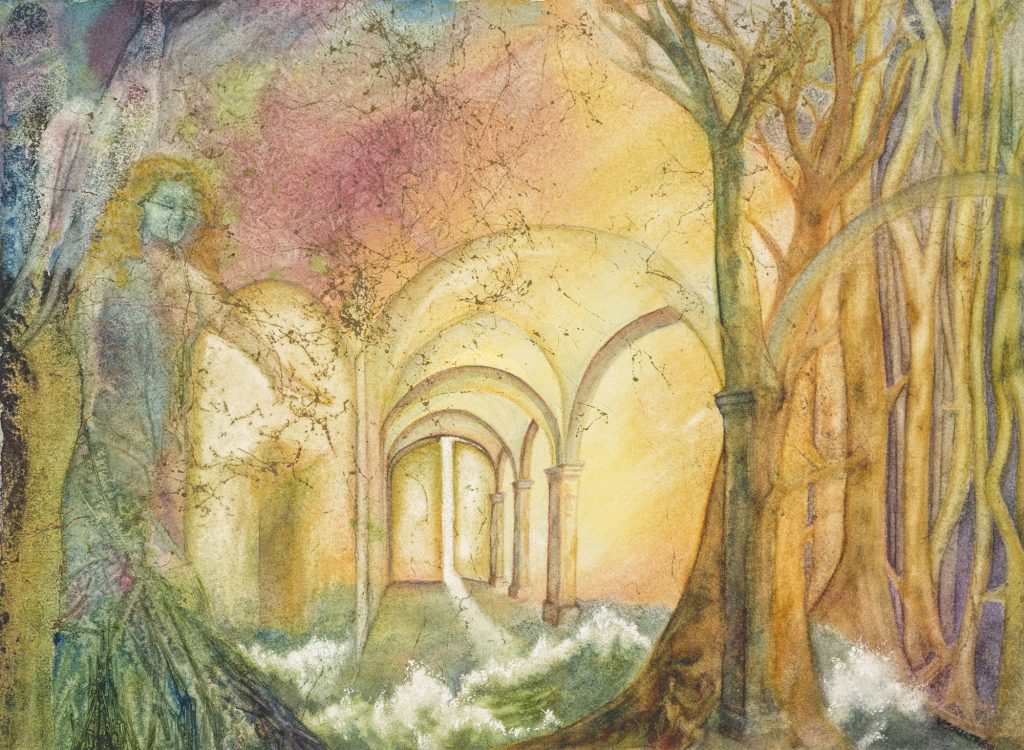 This angelic figure has pushed aside the dark angel at her side and is opening the path into opportunity and abundance…our birthright. Life presents many doorways, possibilities, and potentials. I am reminded that our guides, angels and life itself conspire to open our path to the light and open the doors for us. We make the choice to cleanse ourselves of fears and false beliefs in the waters of life and take the high road to illumination and clarity. We have many choices, and if we can remember to keep our hearts open in exploration and gratitude we will find ourselves safely guided into the light of the Divine Mystery. The trees and their roots remind me to stay grounded so that I may receive this gift of infinite grace into my body and into this life on Earth.